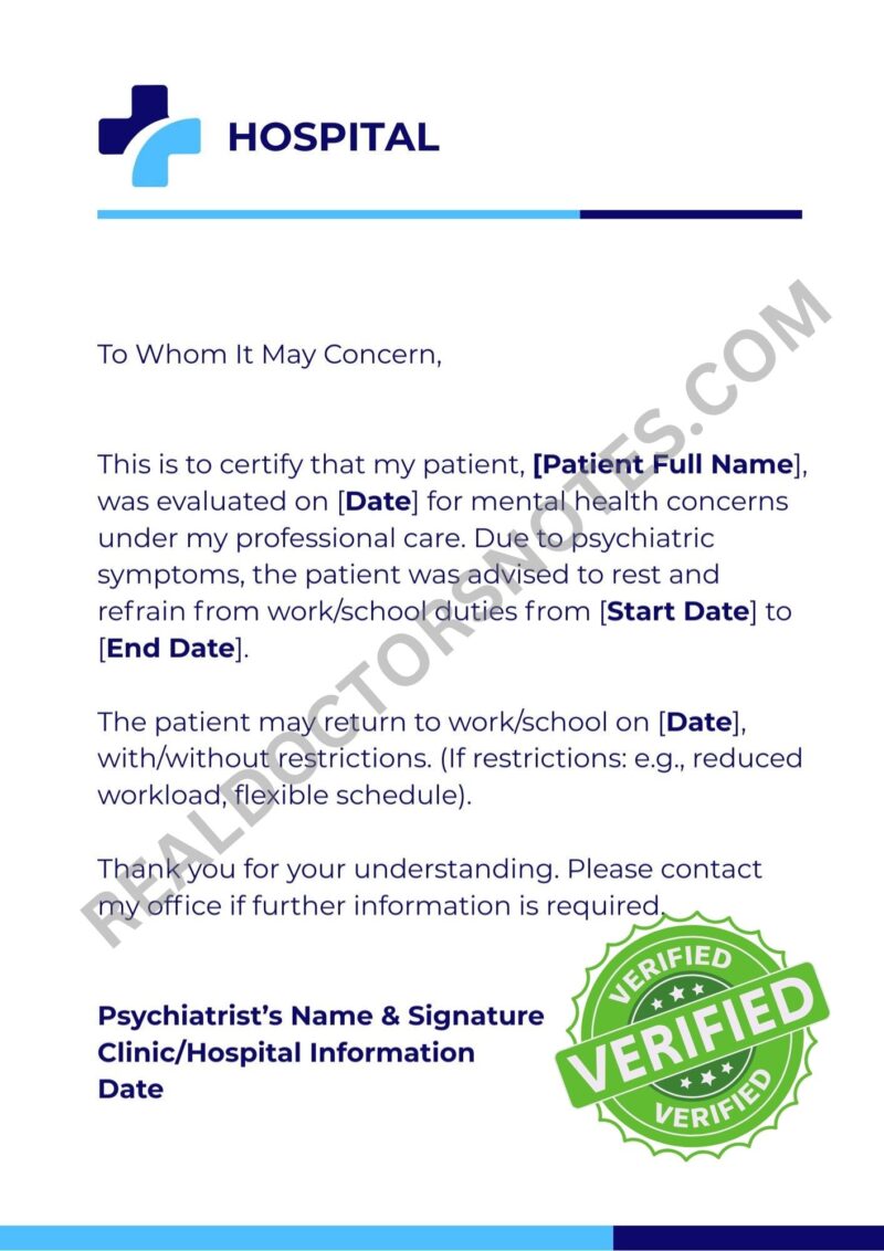 Online Psychiatrist Doctor’s Note: The psychiatrist reviews the patient’s symptoms, history, and current state during the online session and determines if a doctor’s note is warranted. It can serve to confirm that a patient requires time away from work or school due to mental health issues, including anxiety, depression, stress, and other psychiatric disorders. This letter is a valid, legally acceptable format that facilitates accommodations in the workplace, academic leniency, or an insurance claim without revealing private clinical information.
